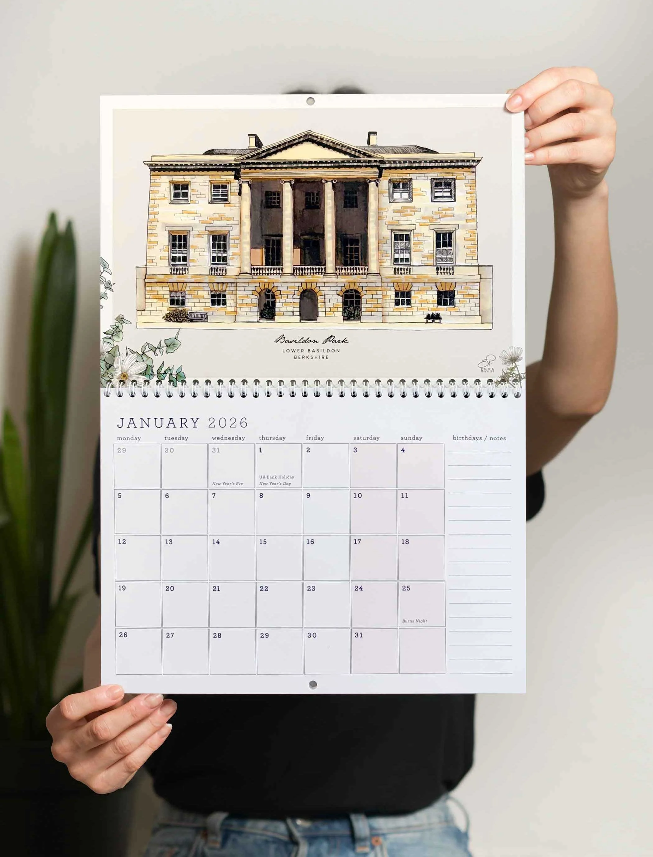 When hung on the wall the calendar measures 30cm W x 42cm H (A3) with a white spiral wire to compliment the pages.